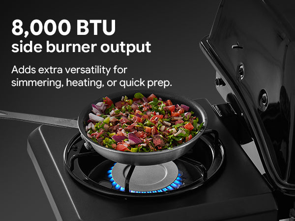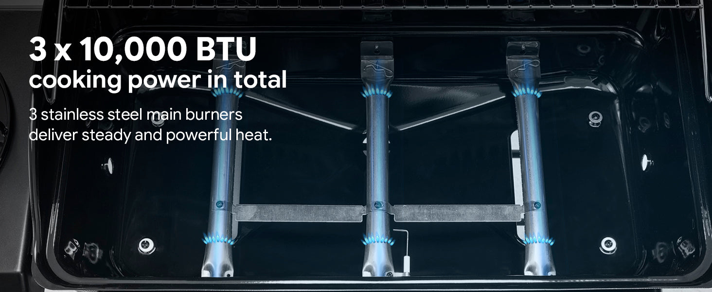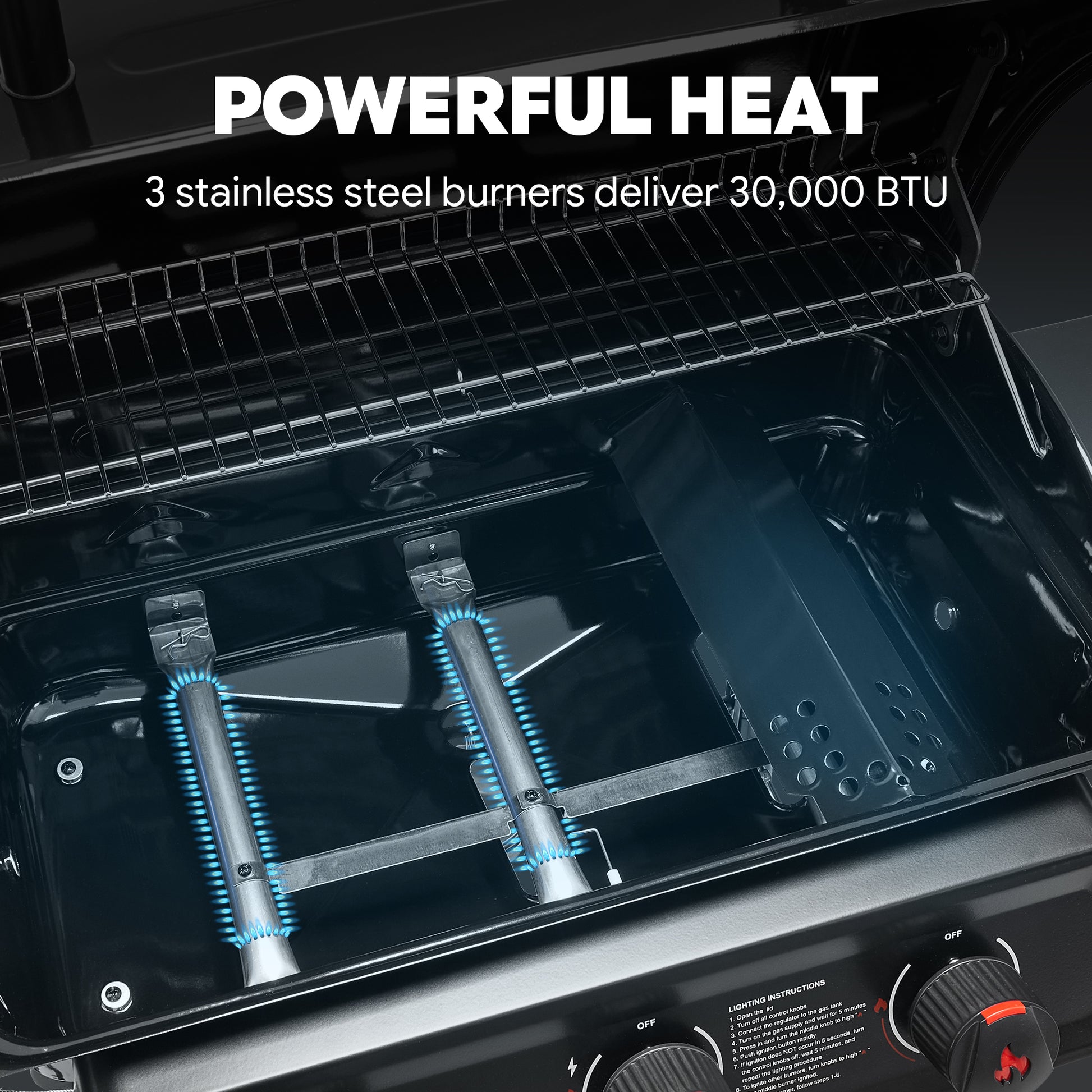 - Powerful & Versatile Burners: This gas grill has three 10,000 BTU main burners plus an 8,000 BTU side burner, delivering 38,000 BTU total for versatile high-heat grilling. Durable stainless steel ensures long-lasting performance, while the side burner provides precise heat for sauces, side dishes or soups—keeping essentials handy as main burners handle grilling, simplifying outdoor use
