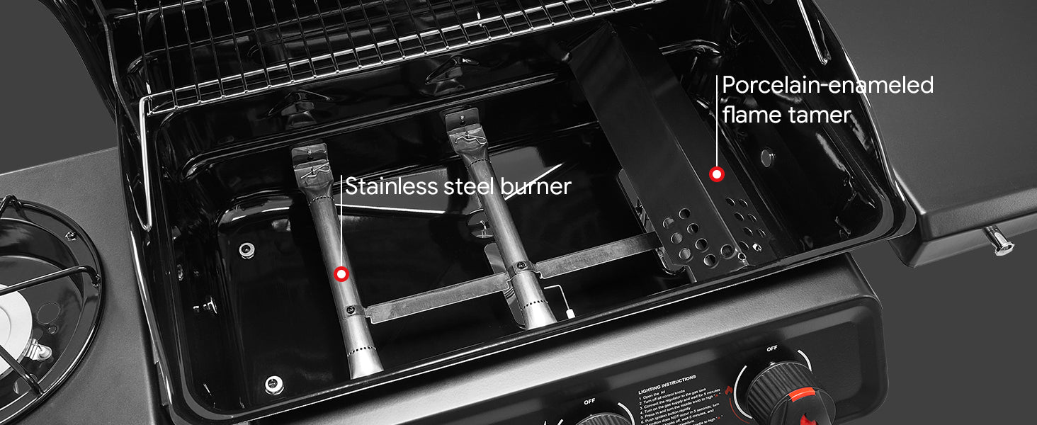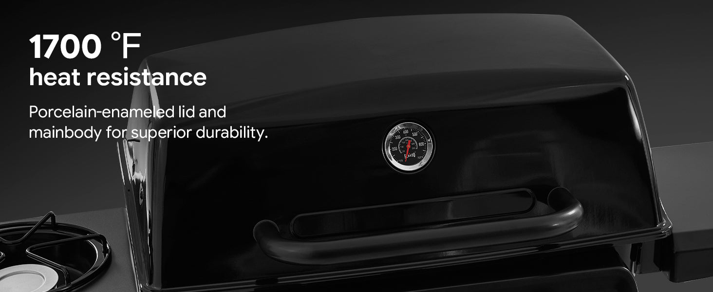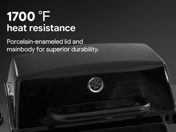 - All-Porcelain-Enamel Design: The main body and lid of this propane grill feature an all-porcelain-enamel design that withstands extreme heat up to 1700℉. This design keeps the gas grill durable, maintains its like-new look and performance, and effectively resists peeling, blistering, and discoloration