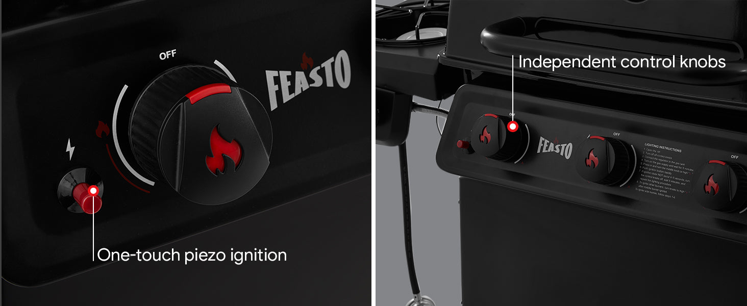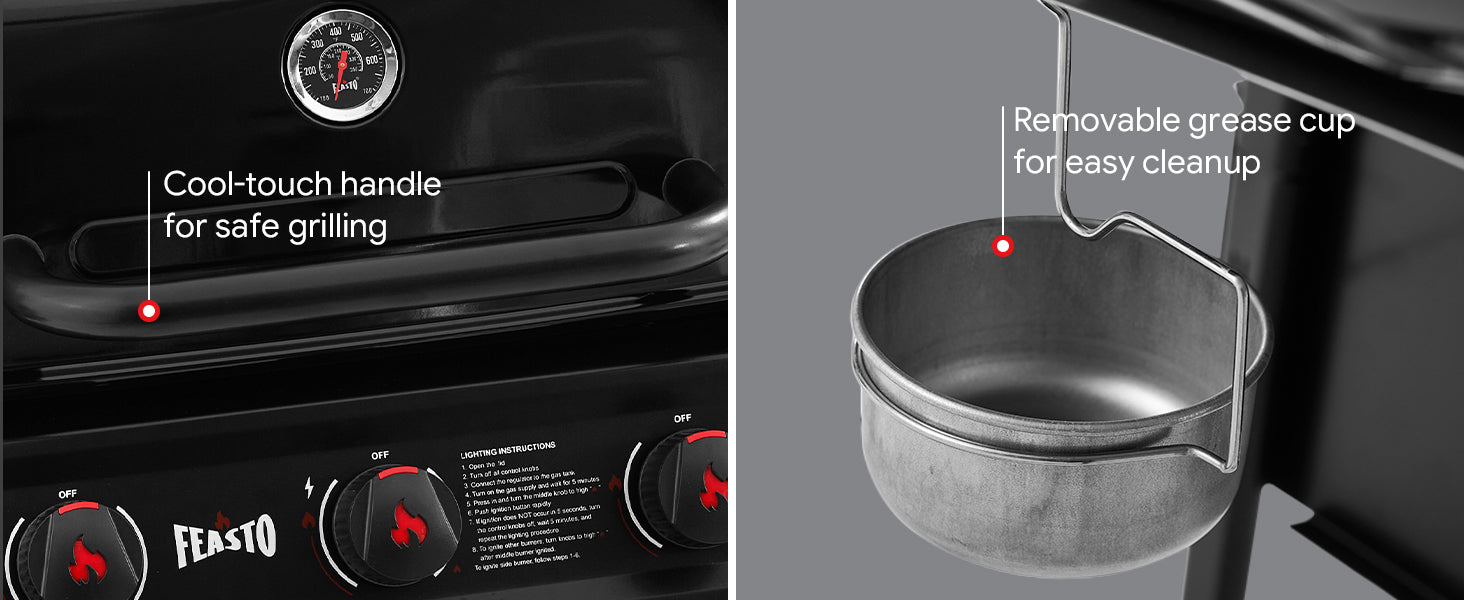 Bring your backyard, garden, or poolside to life with the FEASTO 3 Burner Propane Gas Grill with Side Burner. Its all-porcelain-enamel body and lid withstand high heat up to 1700°F while resisting rust and peeling, making cleanup quick and easy. With three stainless steel burners and an 8,000 BTU side burner delivering a total of 38,000 BTU, plus 504 sq. in. cooking space, you can grill, sear or simmer for family cookouts, tailgating, or weekend gatherings - every meal is effortless and delicious.