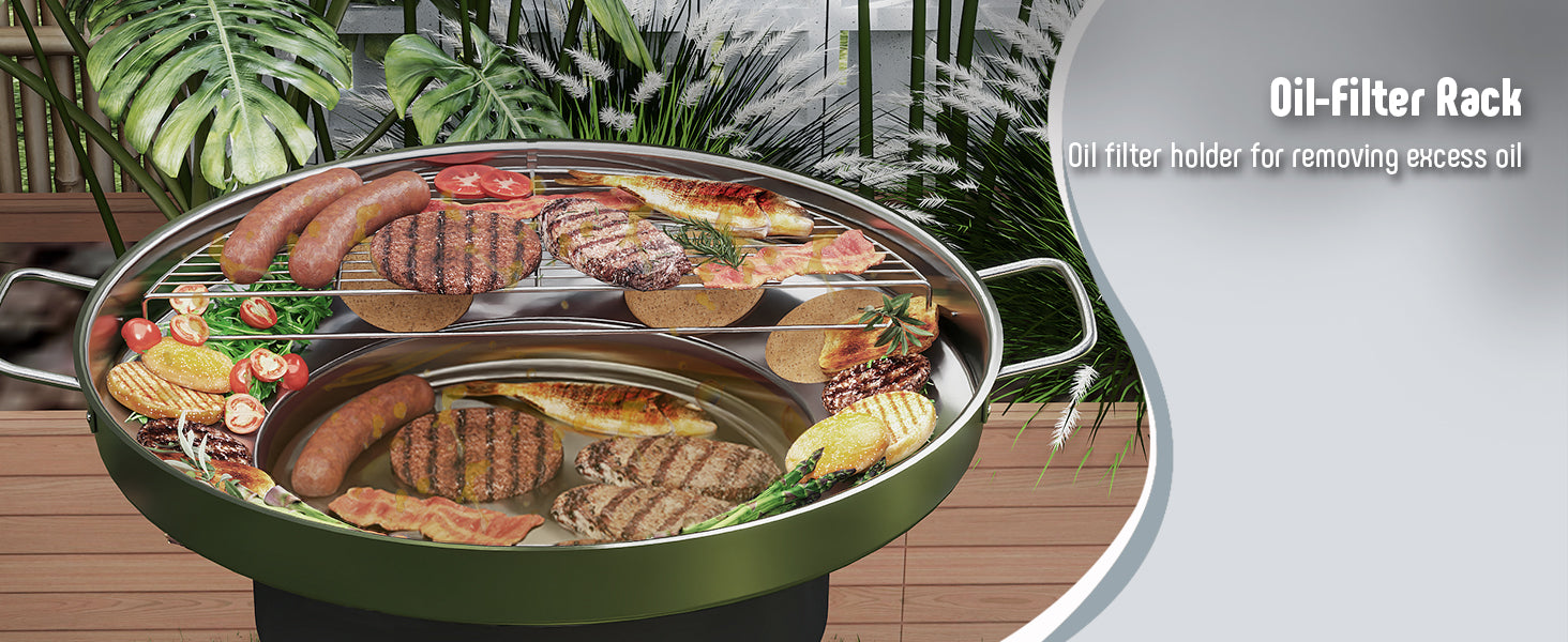 - Premium, Mess-Free Cooking System: Crafted from premium stainless steel with heat-resistant handles. The oil filter rack for healthier meals and easier cleanup, making it ideal for greasy foods like fajitas and sausages.