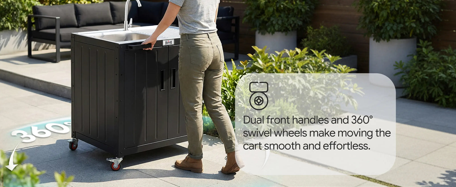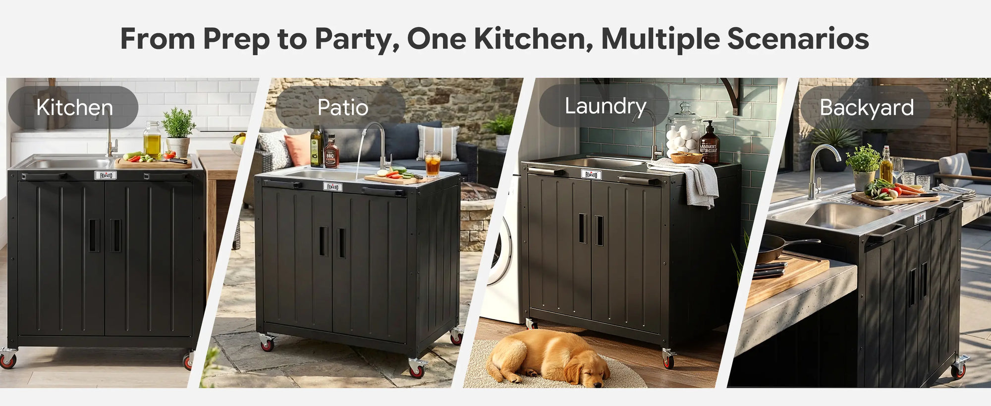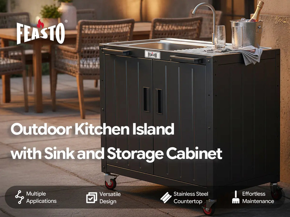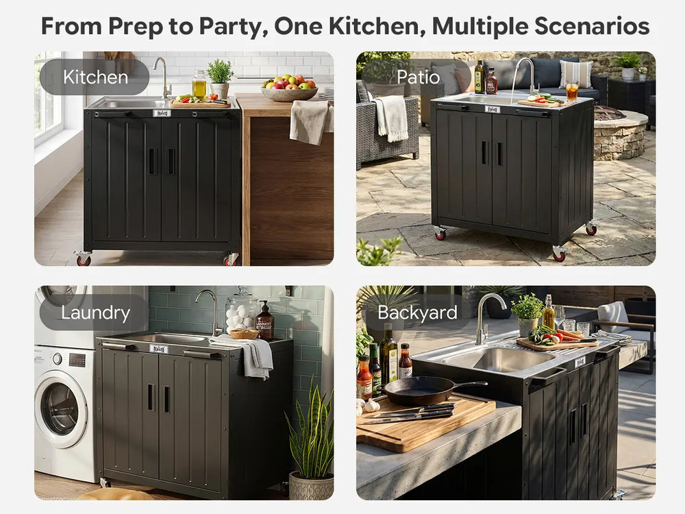 Feasto KT2435D movable utility sink with storage cabinet provides you more vivid outdoor life. Total 95 gallons of this utility sink with cabinet can hold all your cleaning supplies and cooking accessories. Place it in laundry room as a laundry sink. Move it to garage to be a garage sink for efficiency. Or think of it as an outdoor sink, the 304 stainless steel sink with drainboard and storage cabinet serve you for food prepare, washing, etc. The storage cabinet hold your tools and accessories. In addition, this outdoor kitchen sink can be connected with KT2435C to form a complete outdoor kitchen Island. Image your garden party or family gathering with the outdoor kitchen station for feasto!