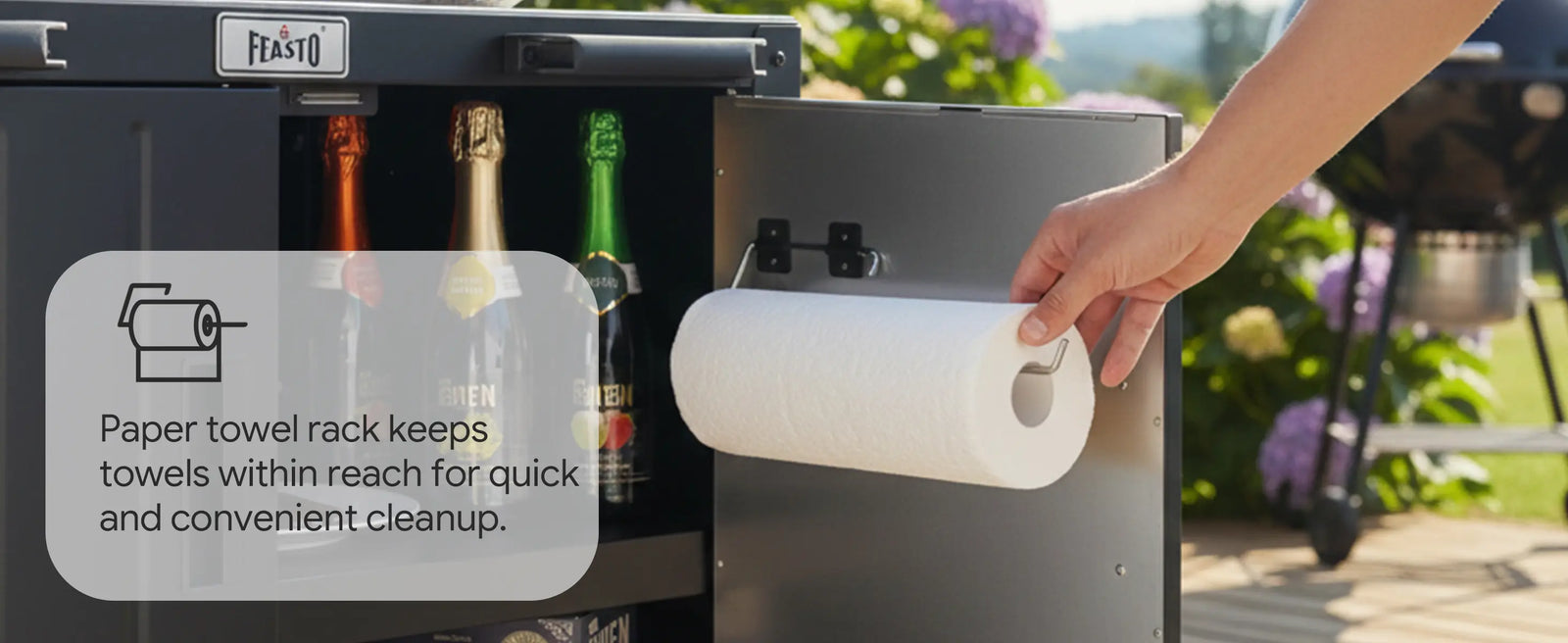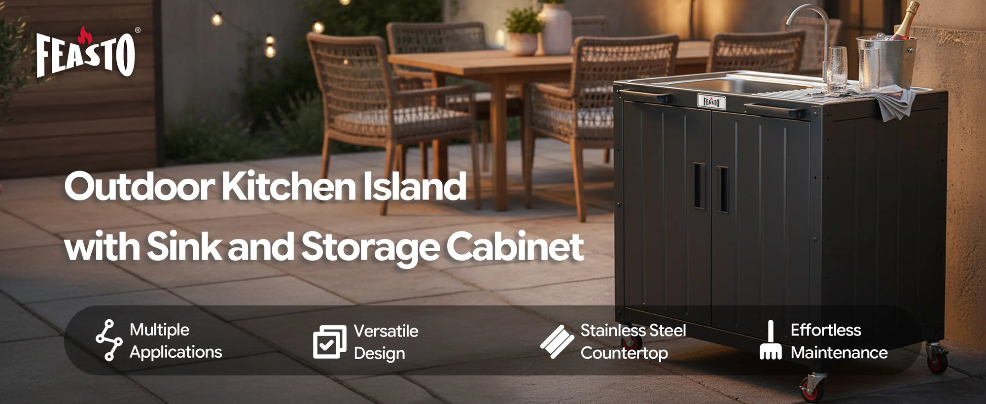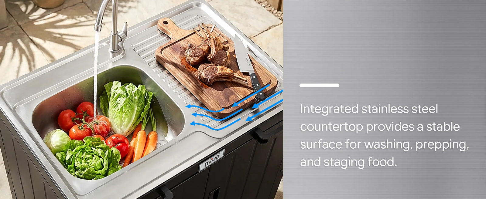 Feasto KT2435D movable utility sink with storage cabinet provides you more vivid outdoor life. Total 95 gallons of this utility sink with cabinet can hold all your cleaning supplies and cooking accessories. Place it in laundry room as a laundry sink. Move it to garage to be a garage sink for efficiency. Or think of it as an outdoor sink, the 304 stainless steel sink with drainboard and storage cabinet serve you for food prepare, washing, etc. The storage cabinet hold your tools and accessories. In addition, this outdoor kitchen sink can be connected with KT2435C to form a complete outdoor kitchen Island. Image your garden party or family gathering with the outdoor kitchen station for feasto!