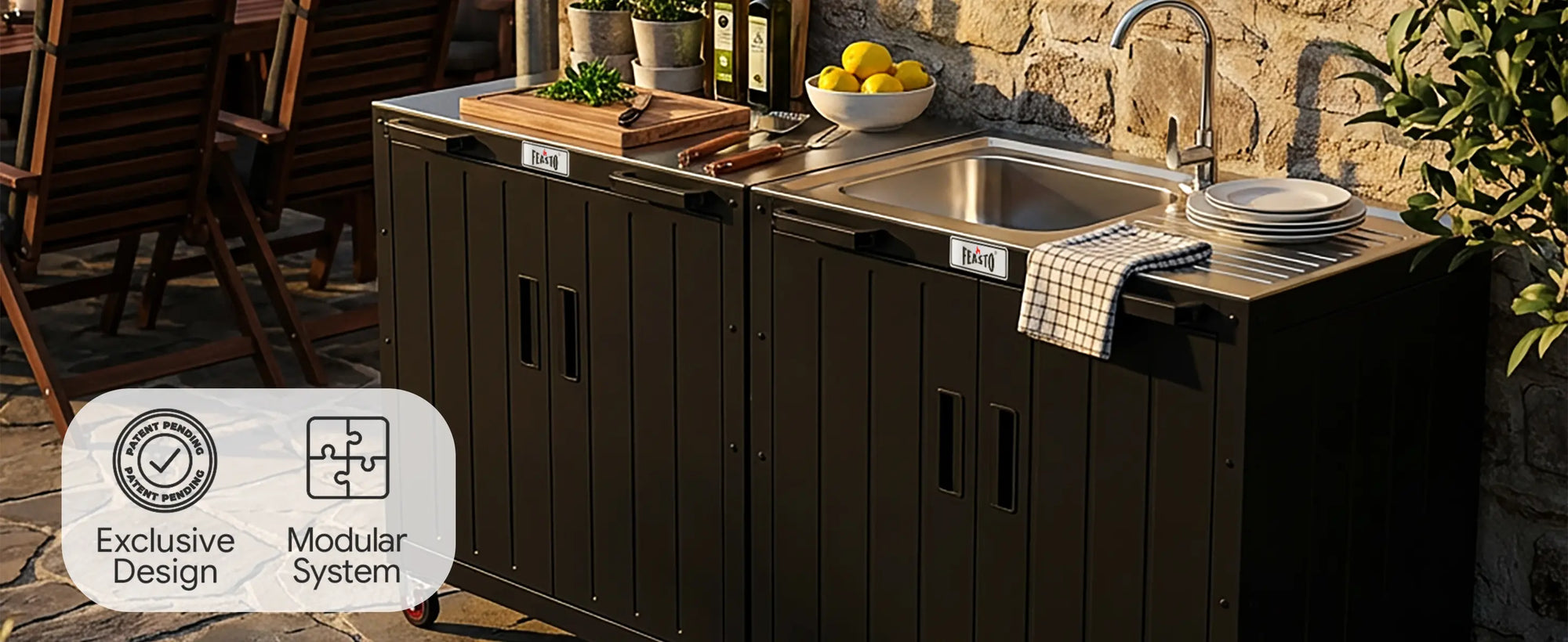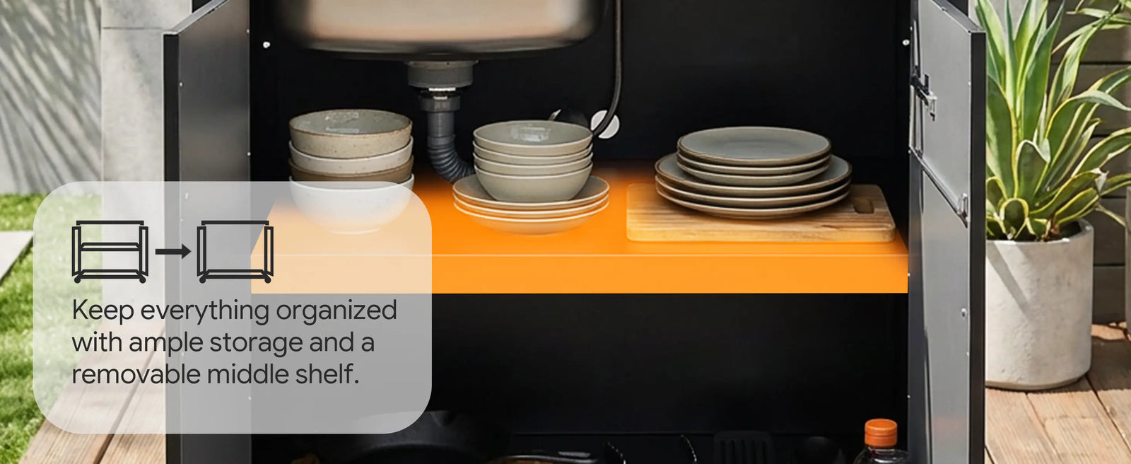 Modular Outdoor Kitchen Station: Easily connected with KT2435C,the outdoor kitchen table, form outdoor kitchen island with sink to prepare food or place grills and pizza oven. Image to prepare all the party needs outdoors with our outdoor kitchen island. Enlarge your indoor/outdoor kitchen by having the freestanding utility sink with storage cabinet.