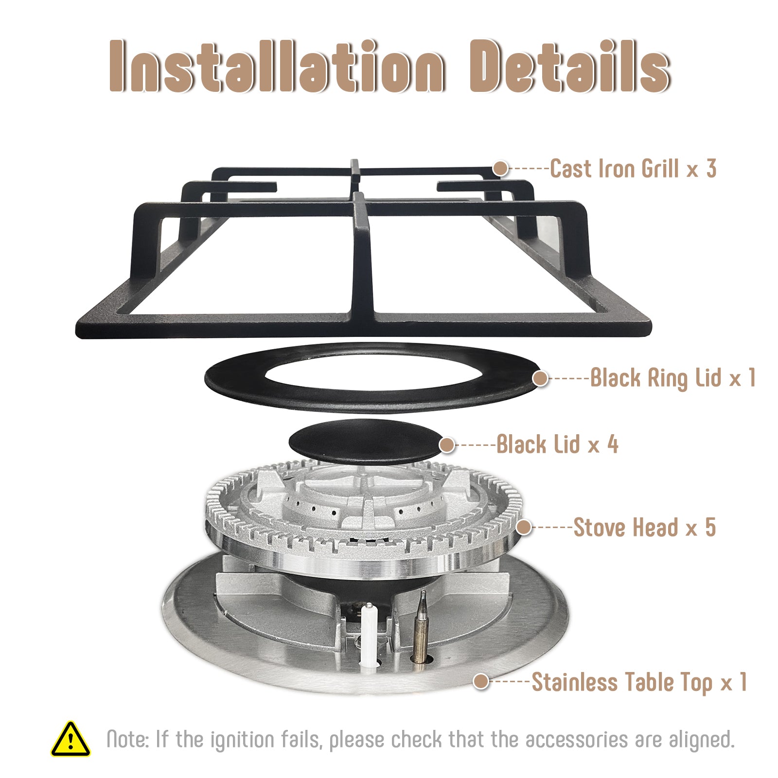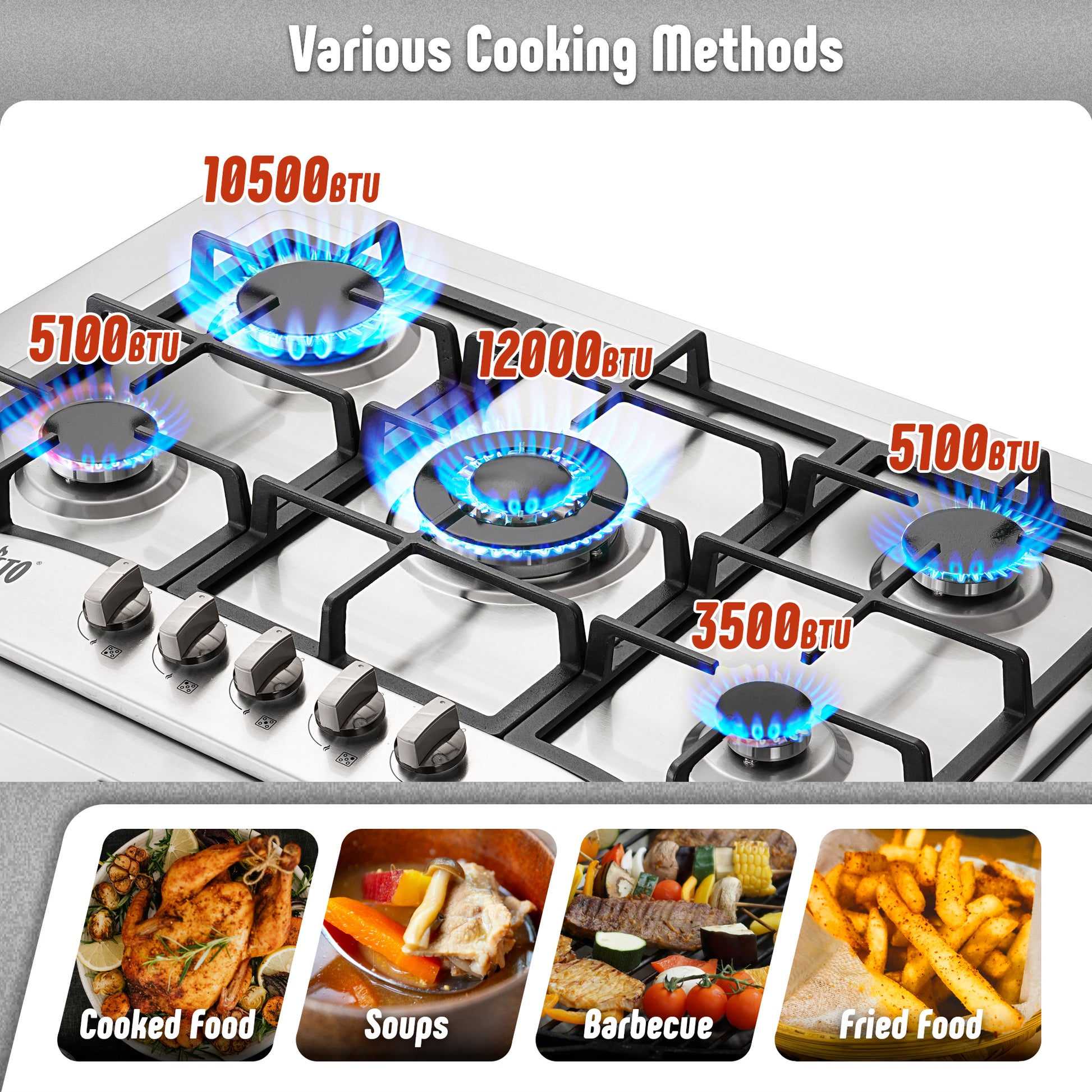 - Powerful Performance: Equipped with five burners and total power of 36,200 BTU. Install a D cell 1.5 volt battery underneath the cooktop, your burner will work.