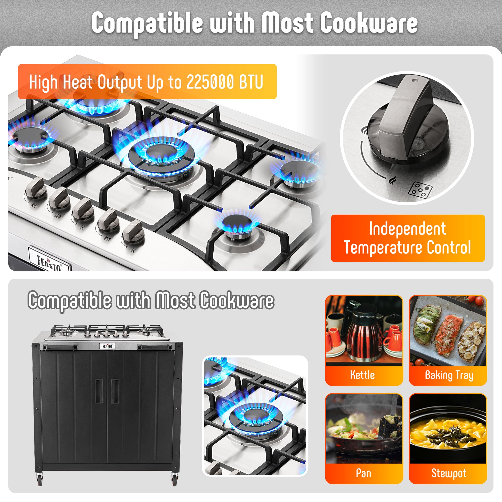 Feasto Movable Outdoor Gas Stove Top with Cabinet adds a touch of charm to your outdoor cooking experience. Featuring five burners with a powerful combined output of 36,200 BTUs, it offers ample heat for all your cooking needs. The movable design greatly facilitates outdoor or backyard gatherings. And the cabinet provides storage space for your cooking essentials, keeping everything organized and within reach. Connect it with our KT2435C or KT2435D to own a outdoor kitchen unit, enrich your outdoor life, entertain your party!