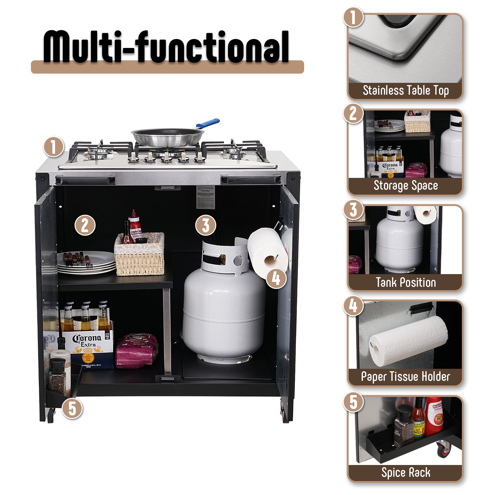 - Additional Storage Space: Leave storage space and gas cylinders, including tissue rack and condiment rack.