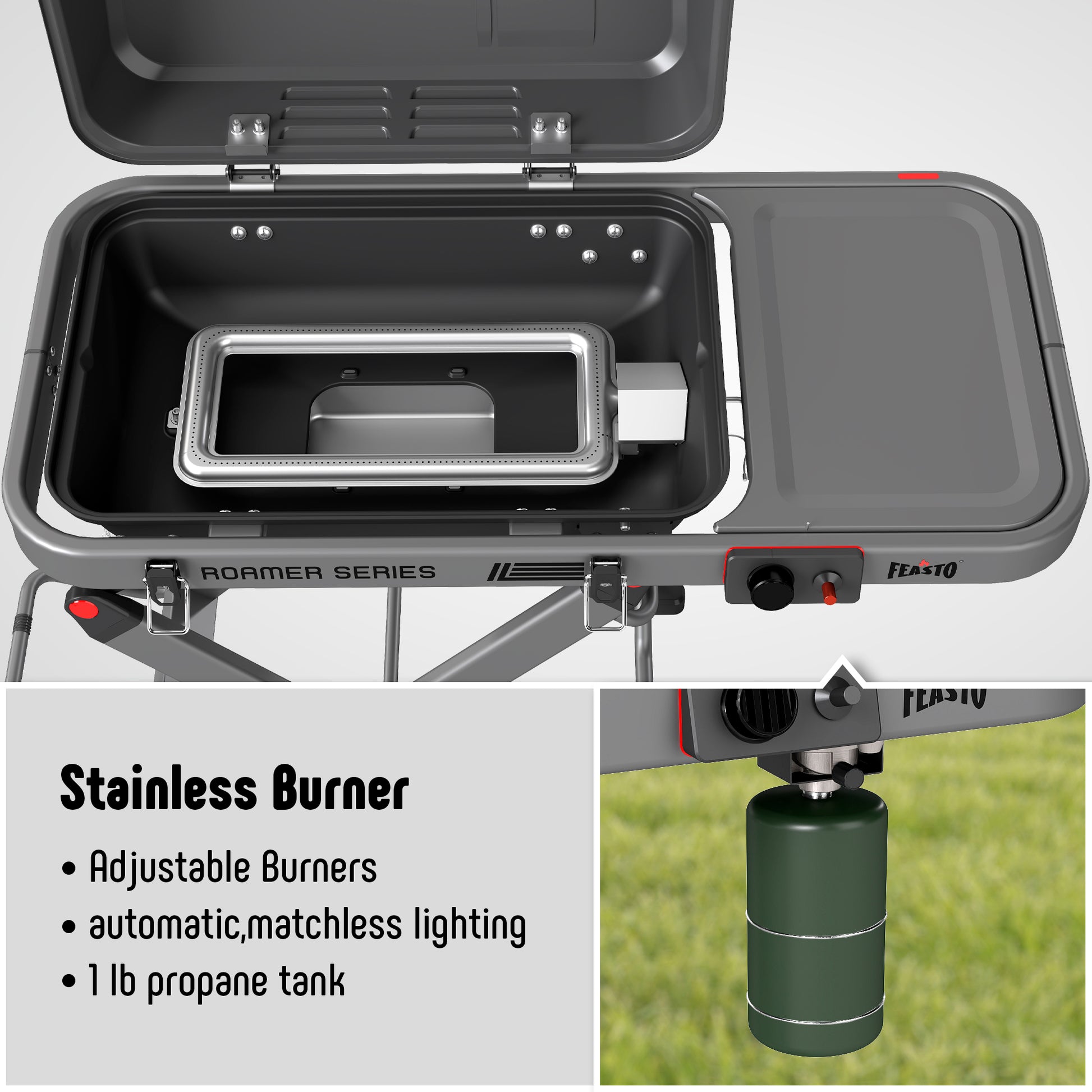 - REMOVABLE STAINLESS GREASE TRAY - A rust-resistant tray slides out for quick cleanup, the traveler compact grill uses disposable 1LP Cylinder, making outdoor cooking easier and keeping your grill simple to maintain.