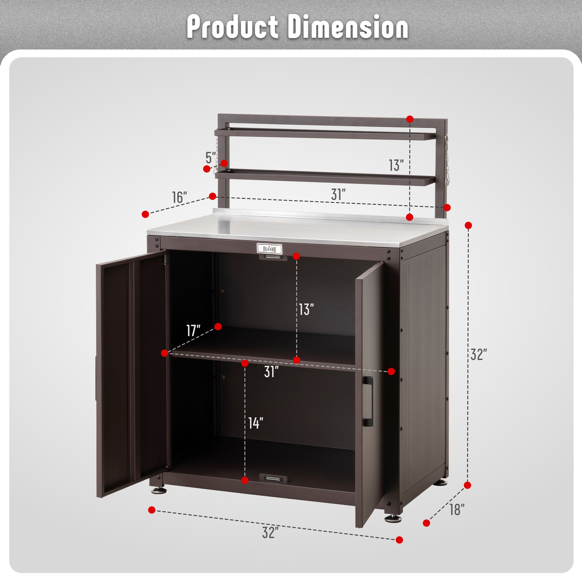 Garden Potting Bench with Storage Cabinet,Outdoor Gardening Table & Work Bench for Plants, Horticulture,Outdoor Workstation with Stainless Steel Tabletop,Outdoor Work Table with Elevated Rack