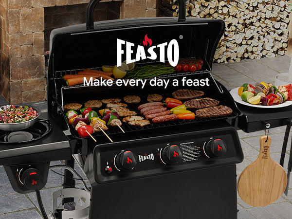 Bring your backyard, garden, or poolside to life with the FEASTO 3 Burner Propane Gas Grill with Side Burner. Its all-porcelain-enamel body and lid withstand high heat up to 1700°F while resisting rust and peeling, making cleanup quick and easy. With three stainless steel burners and an 8,000 BTU side burner delivering a total of 38,000 BTU, plus 504 sq. in. cooking space, you can grill, sear or simmer for family cookouts, tailgating, or weekend gatherings - every meal is effortless and delicious.