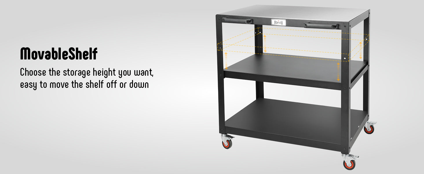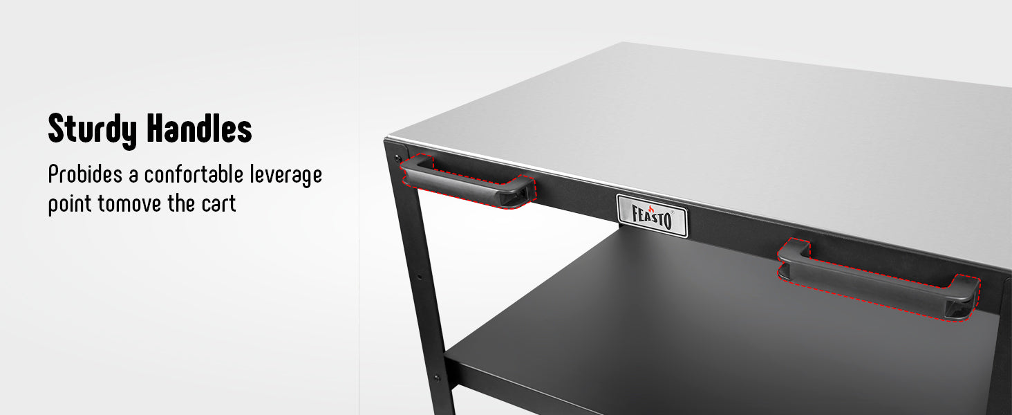 FEASTO KT2435A 3-Shelf Modular Outdoor Kitchen Cart is designed to be the assistant of your cooking or working. For Commercial kitchen or kitchen use, you can regard it as a expand of your counter. Storage all of your dishes or cooking accessories on it. No worries of tight space but just unleash your cooking talent. For outdoor use,you can push it to backyard, garden,patio, it’ll be a accessories storage shelf, a workbench,also a outdoor cooking table.Put your portable grills or Pizza oven on it, enjoy your outdoor cooking life. What’s more, KT2435A can be easily connected with KT2435B,which can be a strong outdoor moving kitchen.