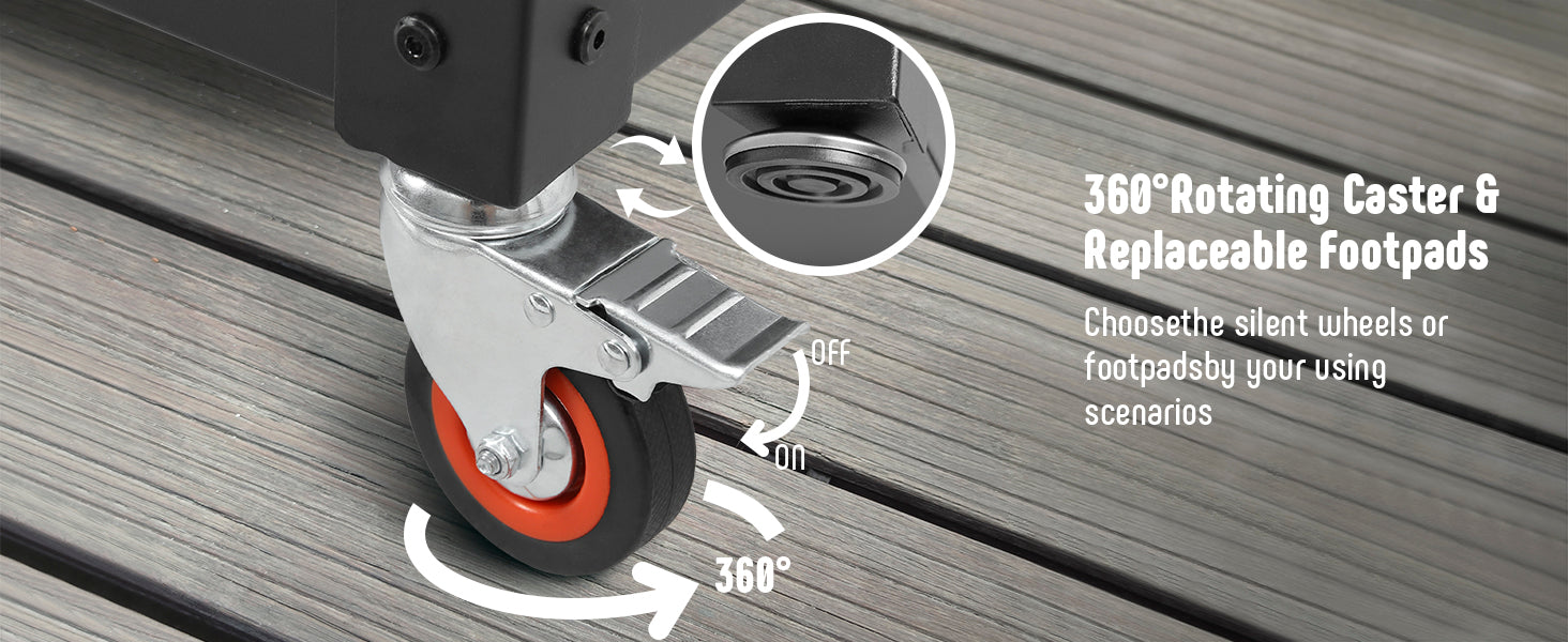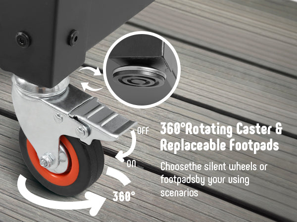 - Humanized Mobile Design: The high-quality 2 handles and 4 silent 360 degree rotating casters for smooth movement. The easy-to-operate foot brake will help you lock the table anywhere.The 4 casters can be replaced with 4 stable feet (in our toolkit) when you decide to stabilize in a position.