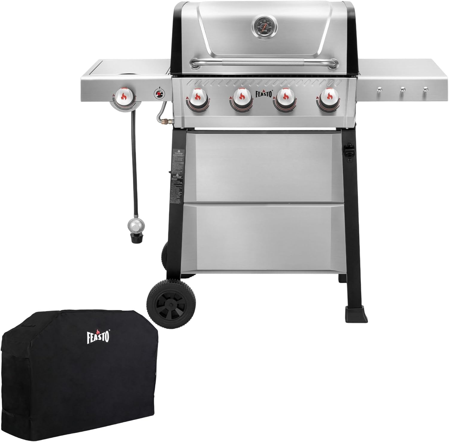 Fire up the Feasto 4-Burner Gas Grill and gather your friends and family for an unforgettable BBQ. With this grill, you can cook perfectly charred steaks, juicy chicken wings, and smoky sausages. The Porcelain-enameled grates ensure even heat distribution for flawless results every time. The delicious aromas fill the air and laughter echoes around. Whether it’s a relaxing family dinner or a lively backyard party, the Feasto grill makes every moment tastier and more memorable
