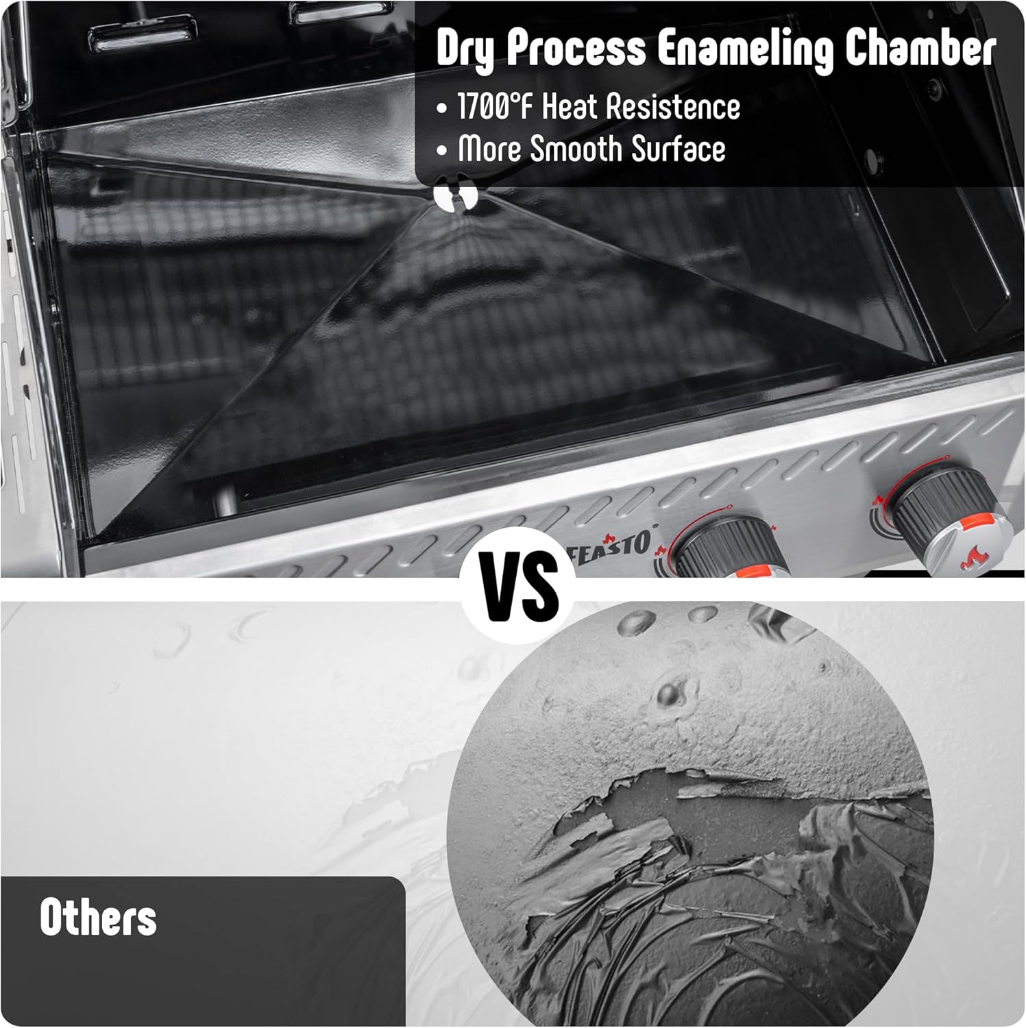 - Porcelain Enamel Body: The outdoor propane grill got premium porcelain enameled stove body can withstand temperatures up to 1700°F, offering excellent heat retention. It also prevents surface peeling, enhancing the stove's durability and overall aesthetic appeal