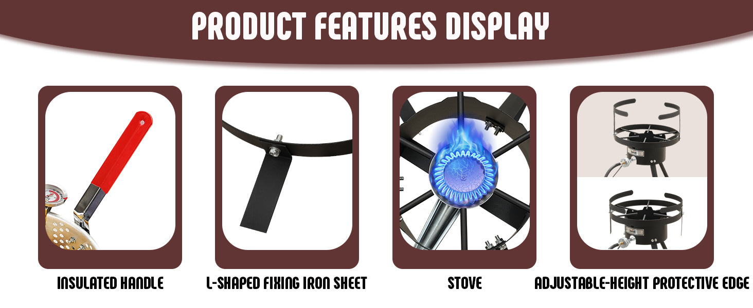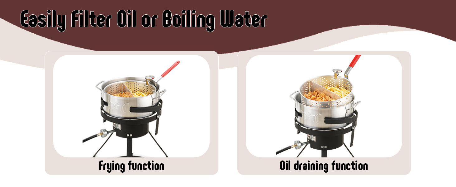 - Multi-functional Cooking: This 10 QT aluminum pot set includes an individual partition, a perforated basket with a plastic handle for dipping, a gas burner stand equipped with a hose and regulator, as well as a thermometer.