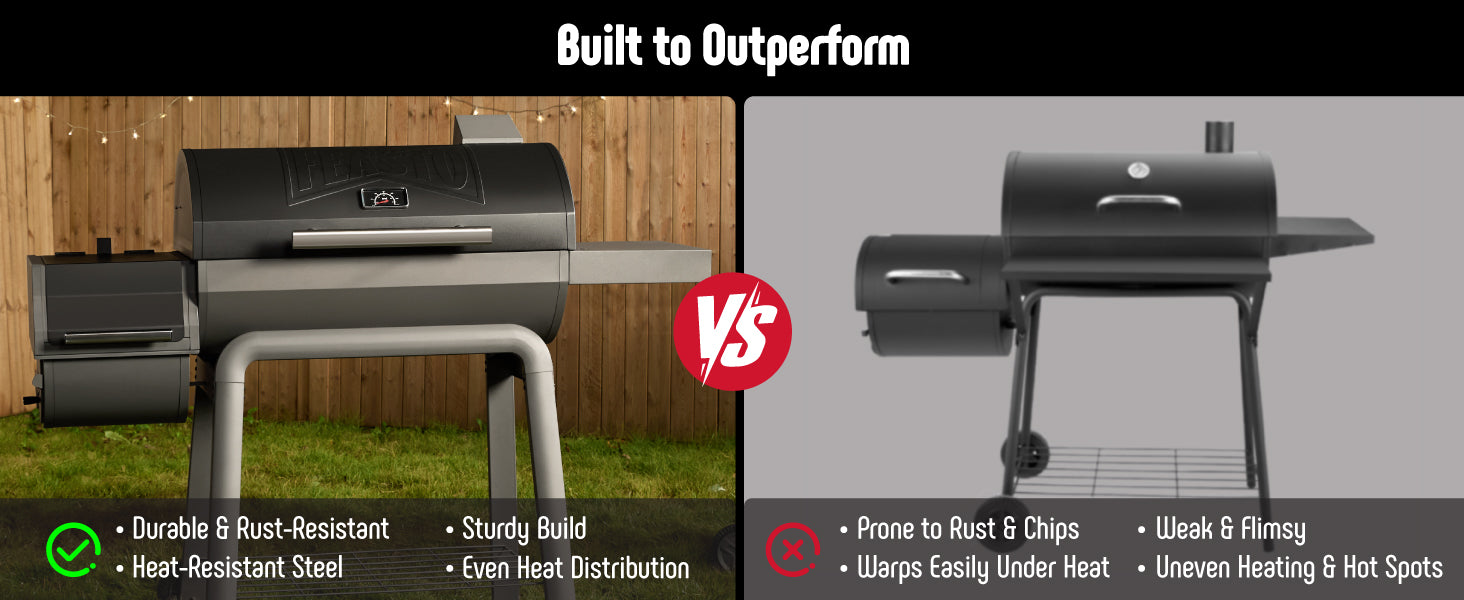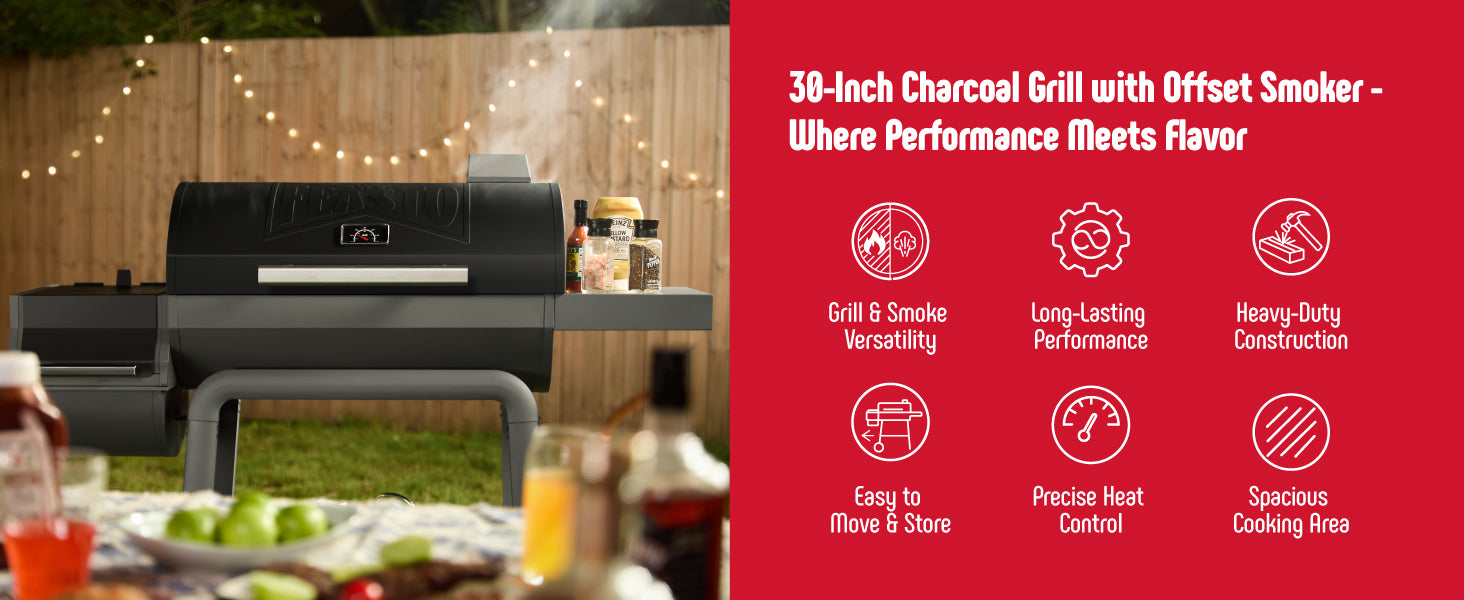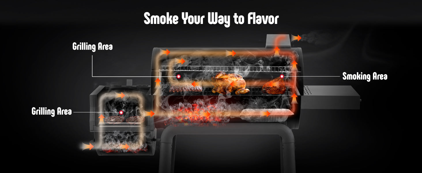 - Offset Smoker Grill: The offset smoker is securely connected to the charcoal grill, ensuring heat and smoke can circulate smoothly through the flue for a delicious smoky flavor. The side furnace door design makes it easy to add charcoal and clean out ashes