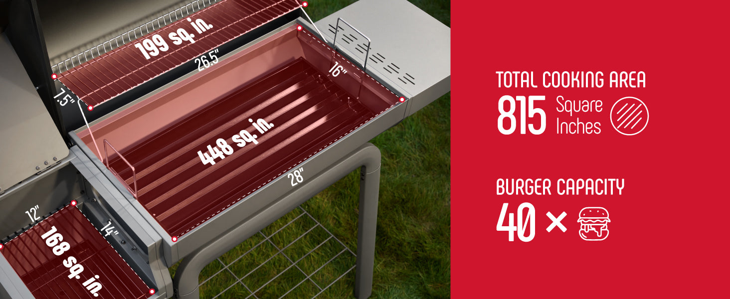- Large Cooking Area: Boasting an expansive 815 square inches of cooking space, including 448 sq. in. cooking grates, 199 sq. in. warming rack, and 168 sq. in. offset smoker
