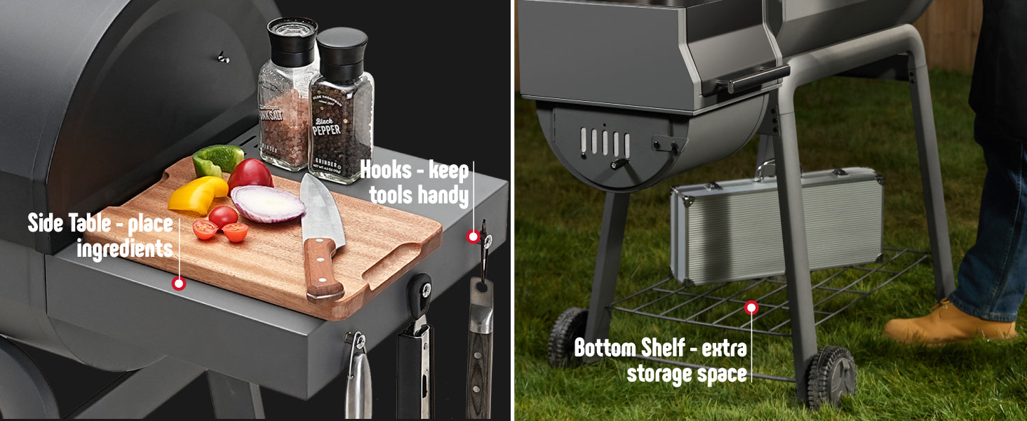 - Ample Space: The durable side table offers ample workspace for preparation, while three built-in hooks conveniently hang grilling tools. Additionally, an extra shelf with a 20-lb capacity provides more storage space. Thoughtfully designed to meet your needs