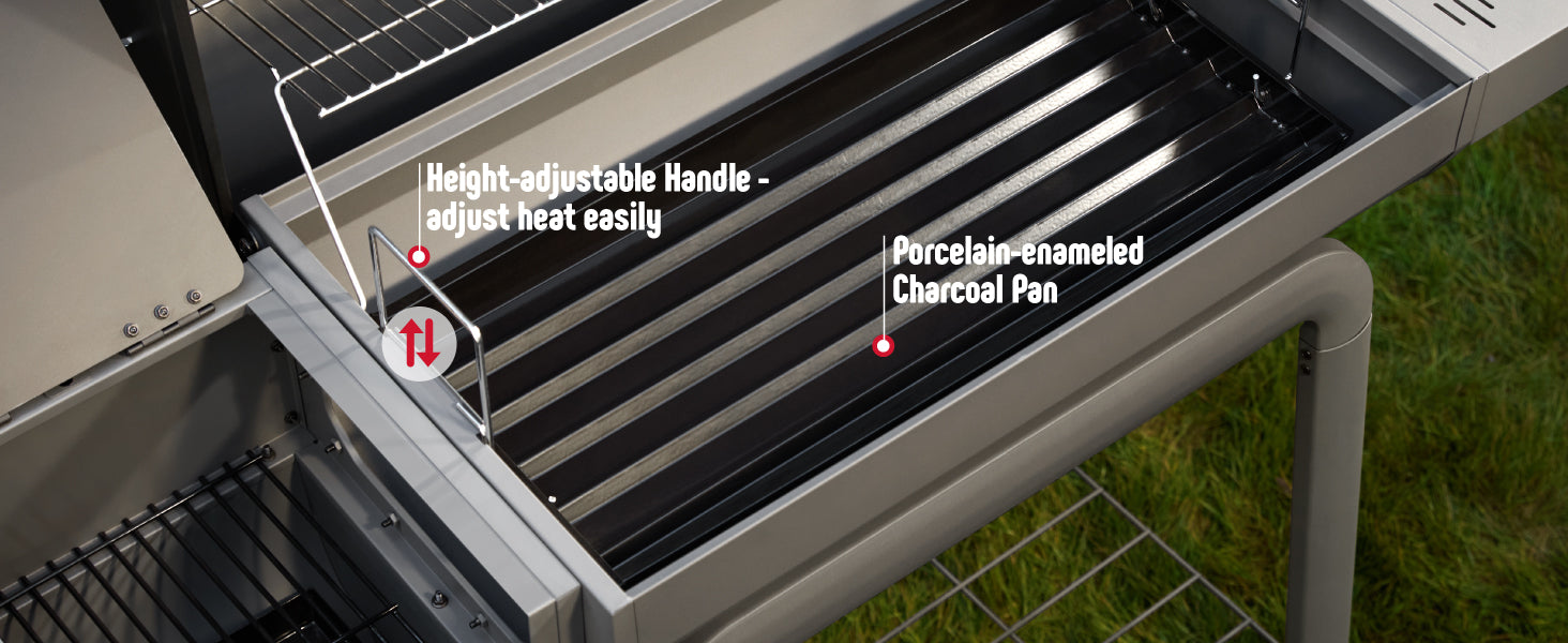 - Precise Temperature Control: Fine-tune airflow for consistent heat with the adjustable air vent and chimney, and with a two-level adjustable charcoal pan, monitor temps with the built-in thermometer. Precise grilling is at your fingertips