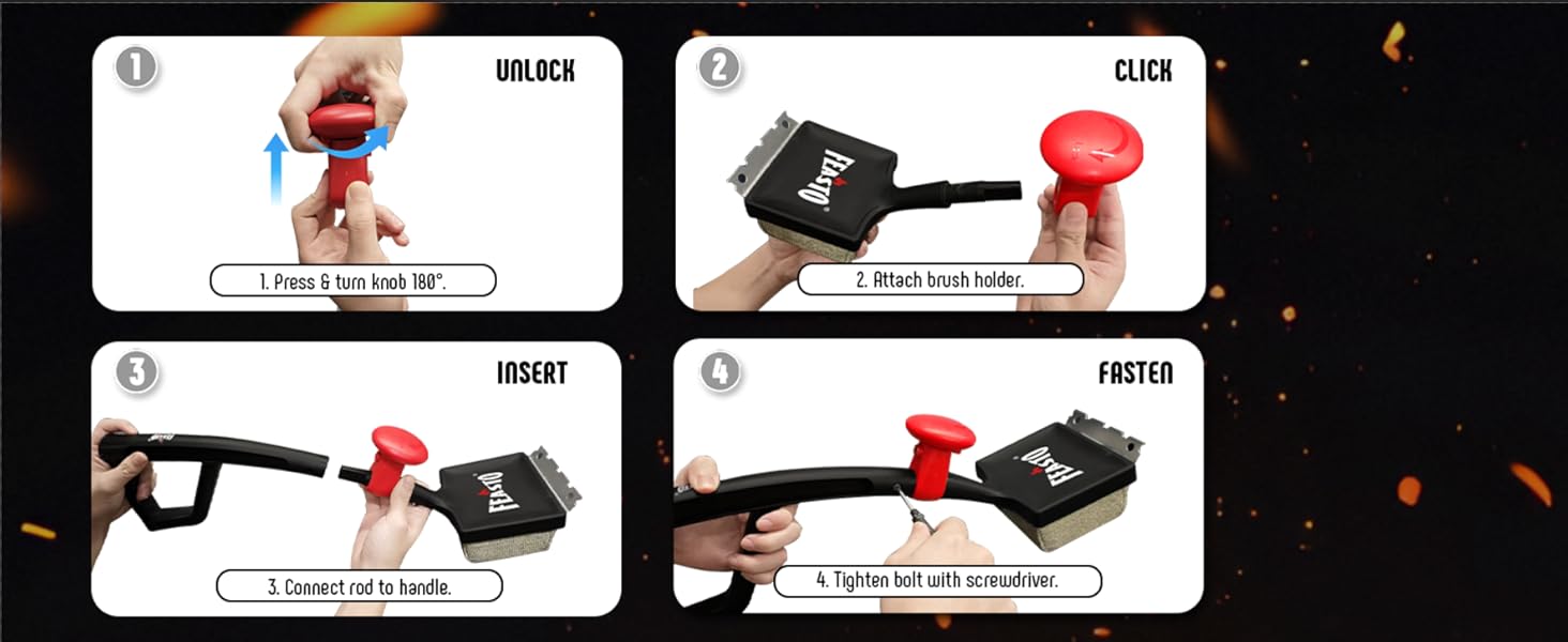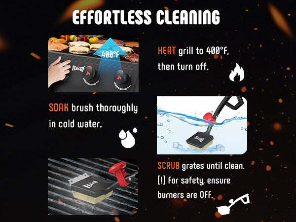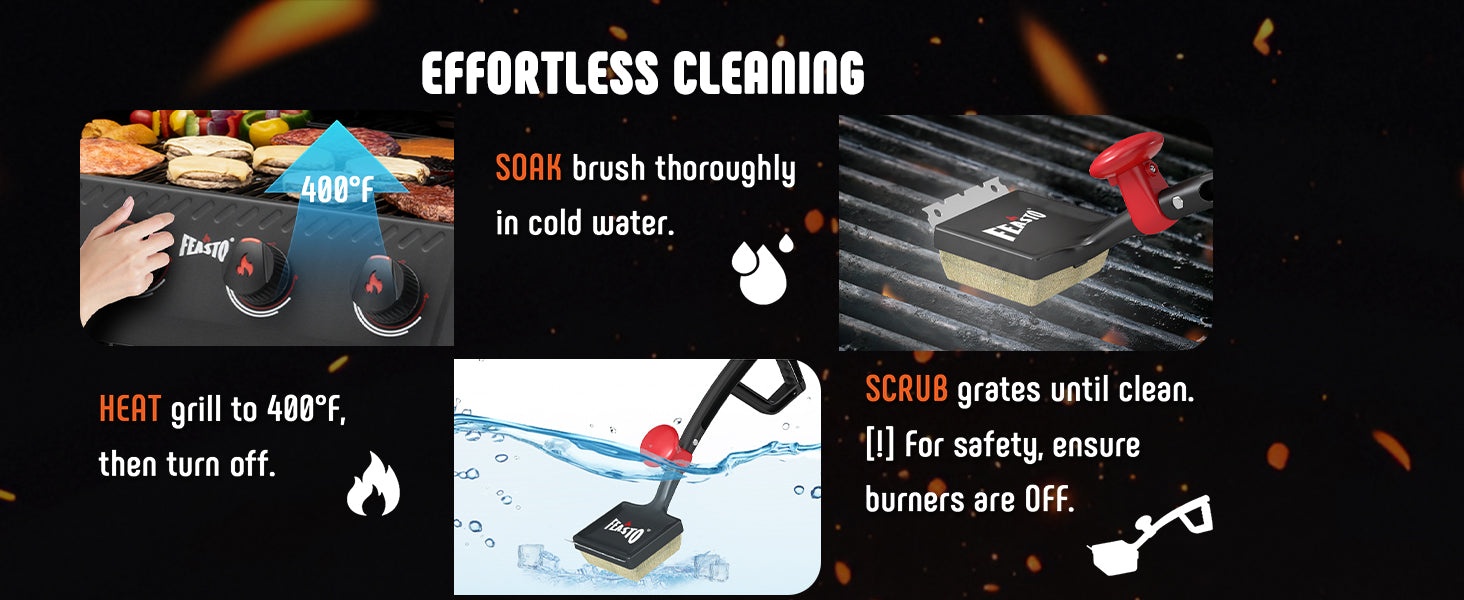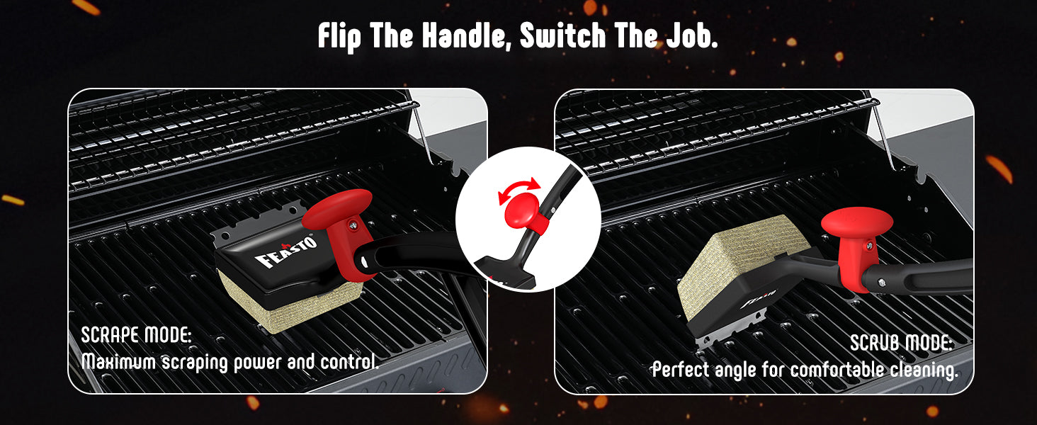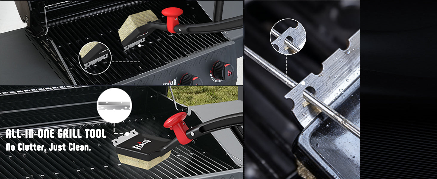 Say goodbye to dangerous bristle shedding and hello to effortless cleaning! The Feasto 6-in-1 Grill Brush combines revolutionary bristle-free interwoven technology with a thermal-sensitive steam sponge for the deepest clean imaginable. Its 360° rotating knob and extended handle provide unmatched control and safety. Plus, with a built-in scraper, bottle opener, and grates hook, it's your all-in-one grilling companion. Transform your BBQ cleanup today!