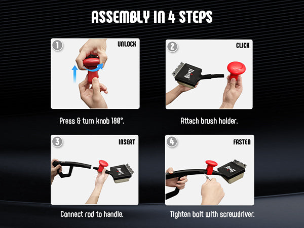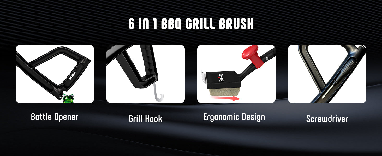 This grill brush combines four essential tools in one: a scraper for tough residues, a steam-generating sponge, a bottle opener, and a retractable grill grate hook—making it your all-in-one outdoor cooking companion.