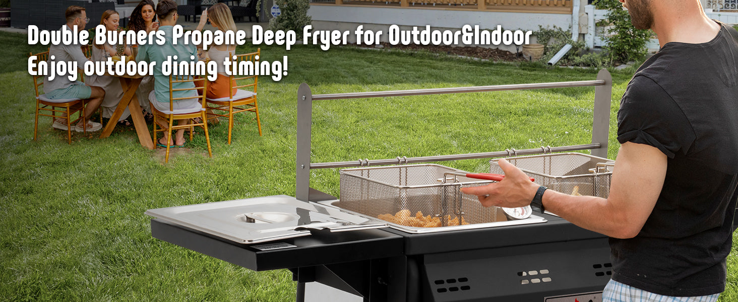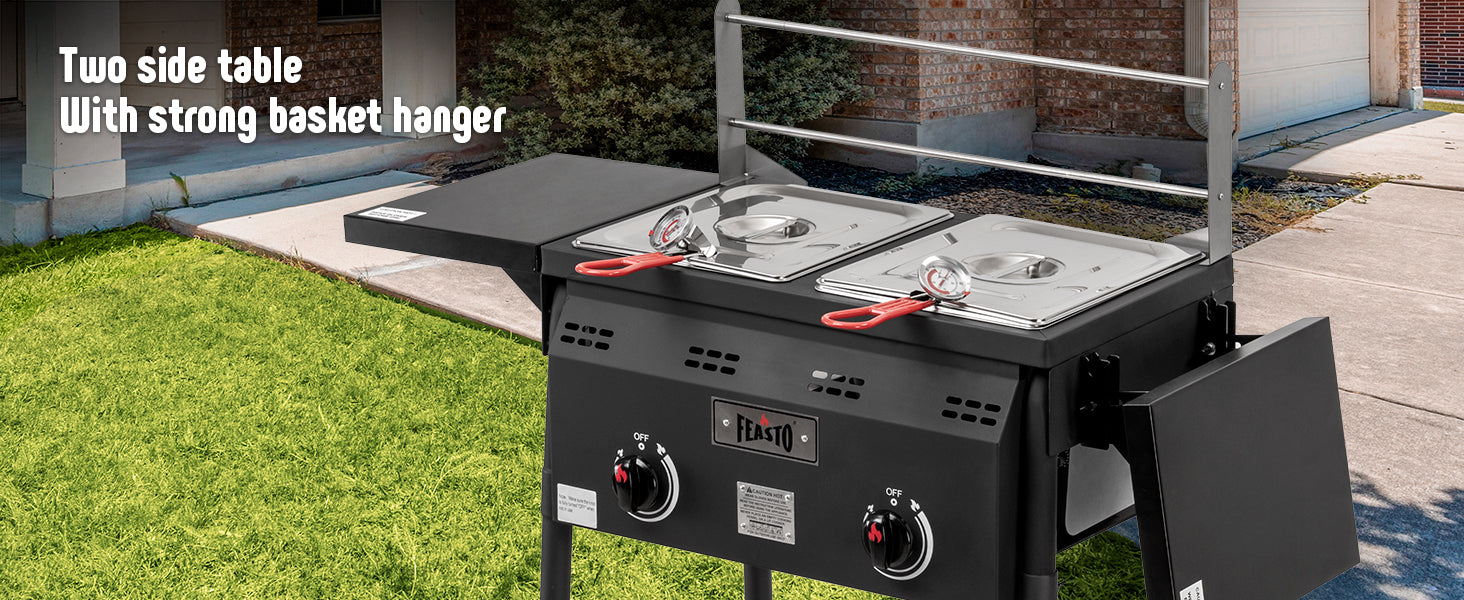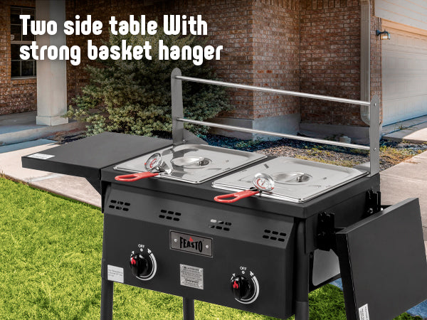 - Independent Temperature Control with Dual Thermometers: Each tank of our propane deep fryer is equipped with its own thermometer for precise heat control. Ensures optimal temperature management for outdoor cooking