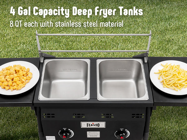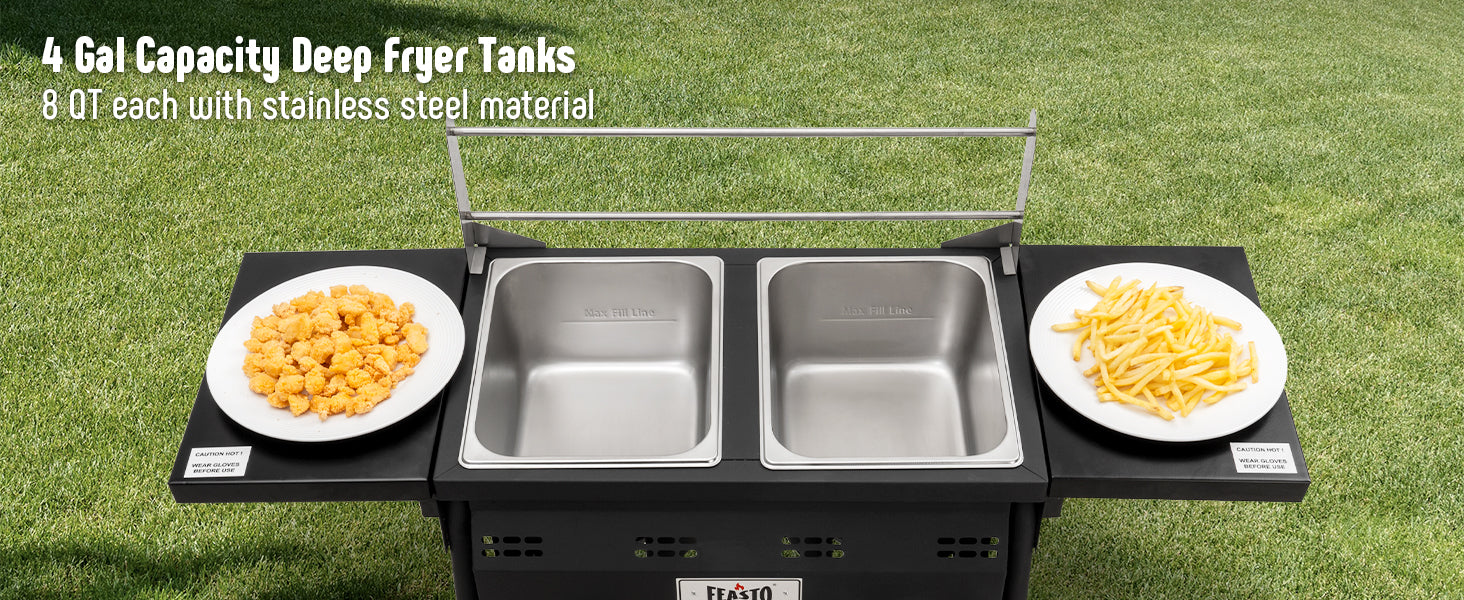 - Dual Tank with Dual Cast Iron Burners:This outdoor propane deep fryer features two separate tanks with total capacity of 4 gal,dual cast iron burners generates 50000BTU,perfect for larger batches at once,cooking everything from fish to fries outdoors