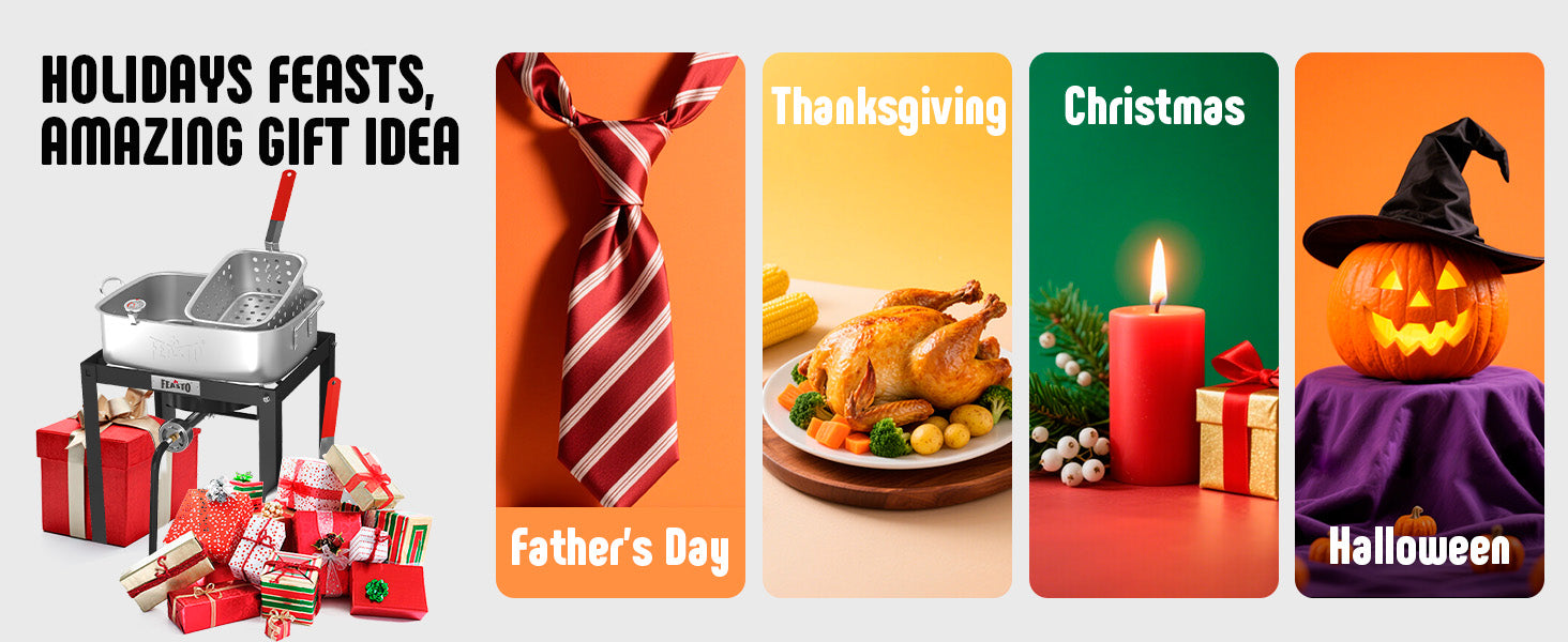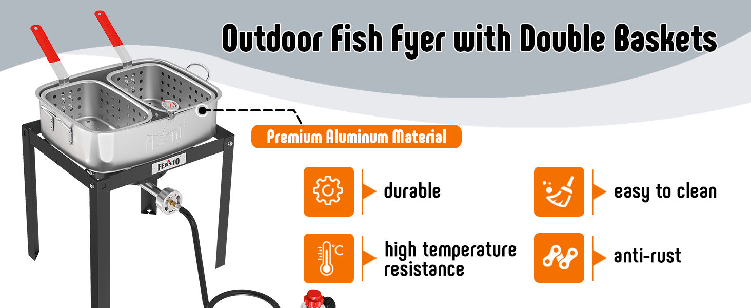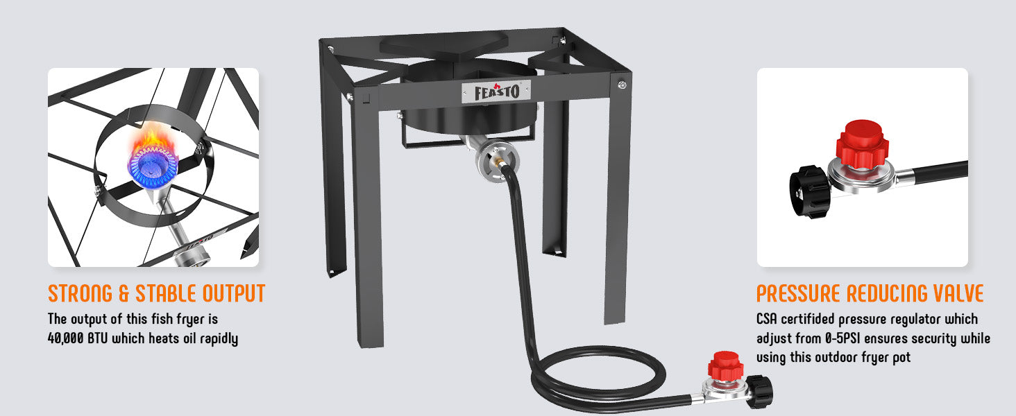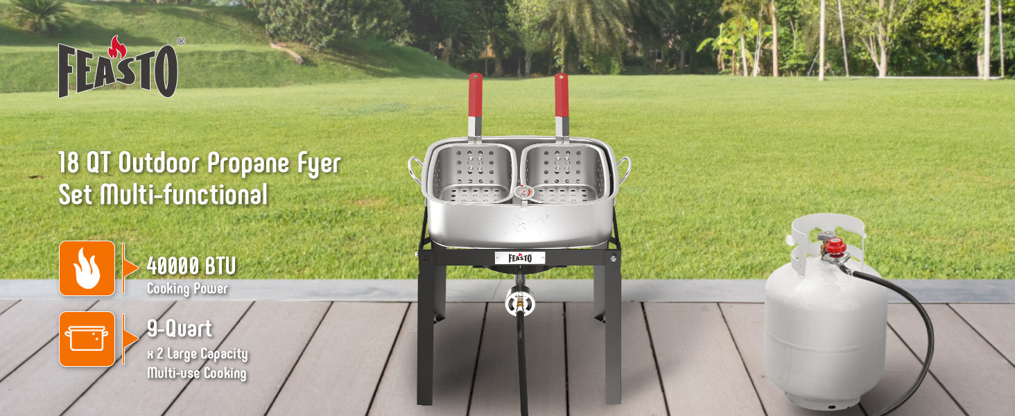 Picture golden fish crackling, wings sizzling, friends laughing around your patio -the Feasto 18-Qt Propane Fish Fryer makes it happen. A 40,000 BTU burner heats fast, dual fryer baskets keep batches moving, and the 5psi regulator ensures safe, steady flames. Chicken wings, French fries, fish fries, seafood, onion rings, donuts and more your favorites are ready. Set up takes less than 15 minutes, fry like a pro, clean up in minutes - then sit back and enjoy the crunch with your families and friends.