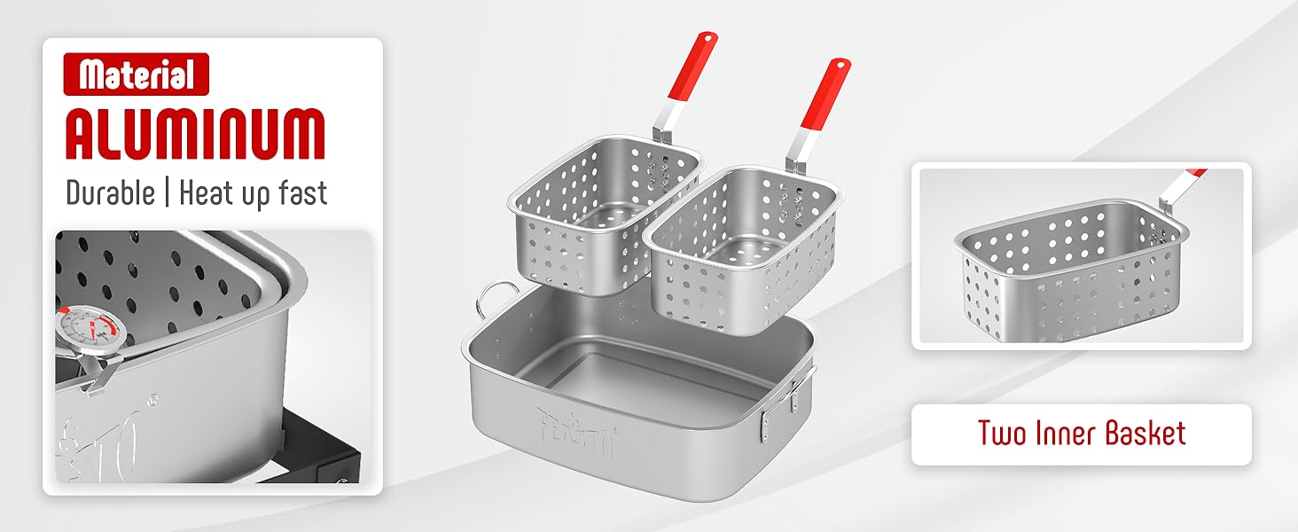 - Pro Tips for Your Fish Fryer: Don’t overfill oil; preheat baskets to prevent sticking; aluminum may discolor but won’t affect performance - just heat, hang, and enjoy golden results