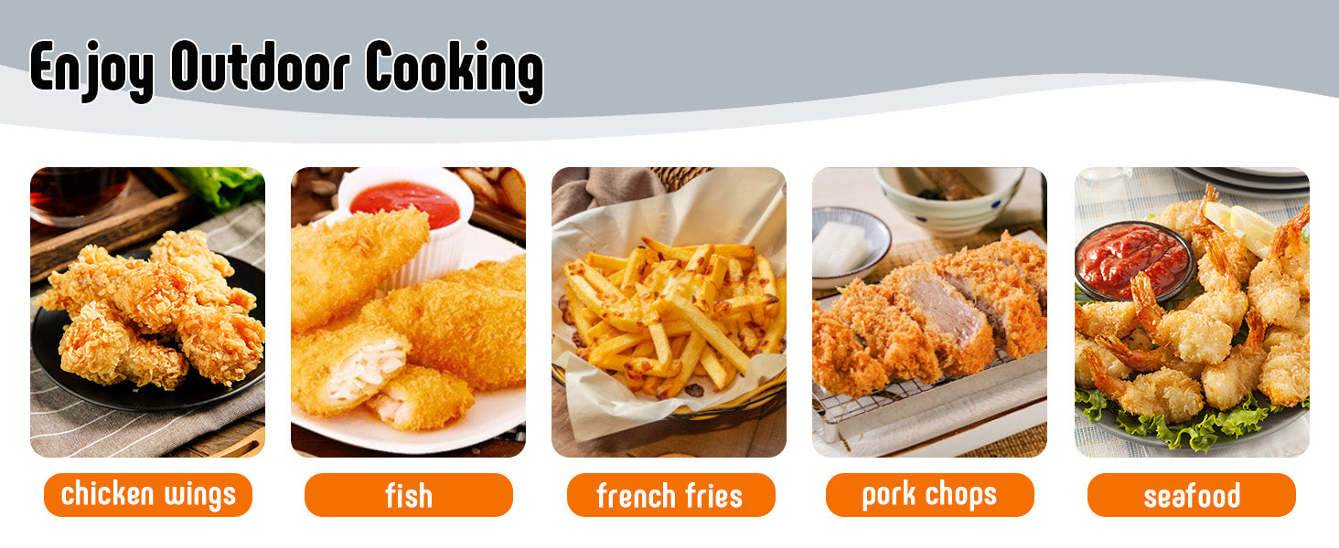 - Multi-Function Cooking: This outdoor fish fryer pot with large capacity for steaming, boiling and simmering. Fry up fries, burgers, onion rings, shrimp, donuts, cornbread, and potato chips. Boiling seafood or vegetables as find. An excellent addition to your outdoor cooking setup
